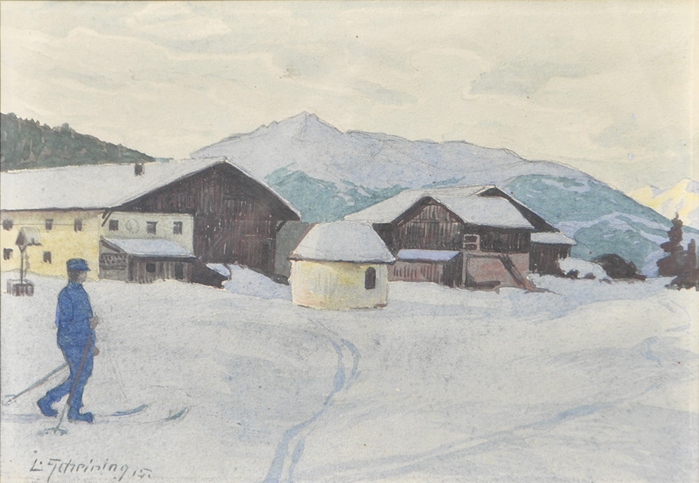 Leopold Scheiring (Nassereith 1884 – 1927) Sciatore davanti a Rosskogel, 1915;Acquerello, 12 x 17,5 cm, in cornice