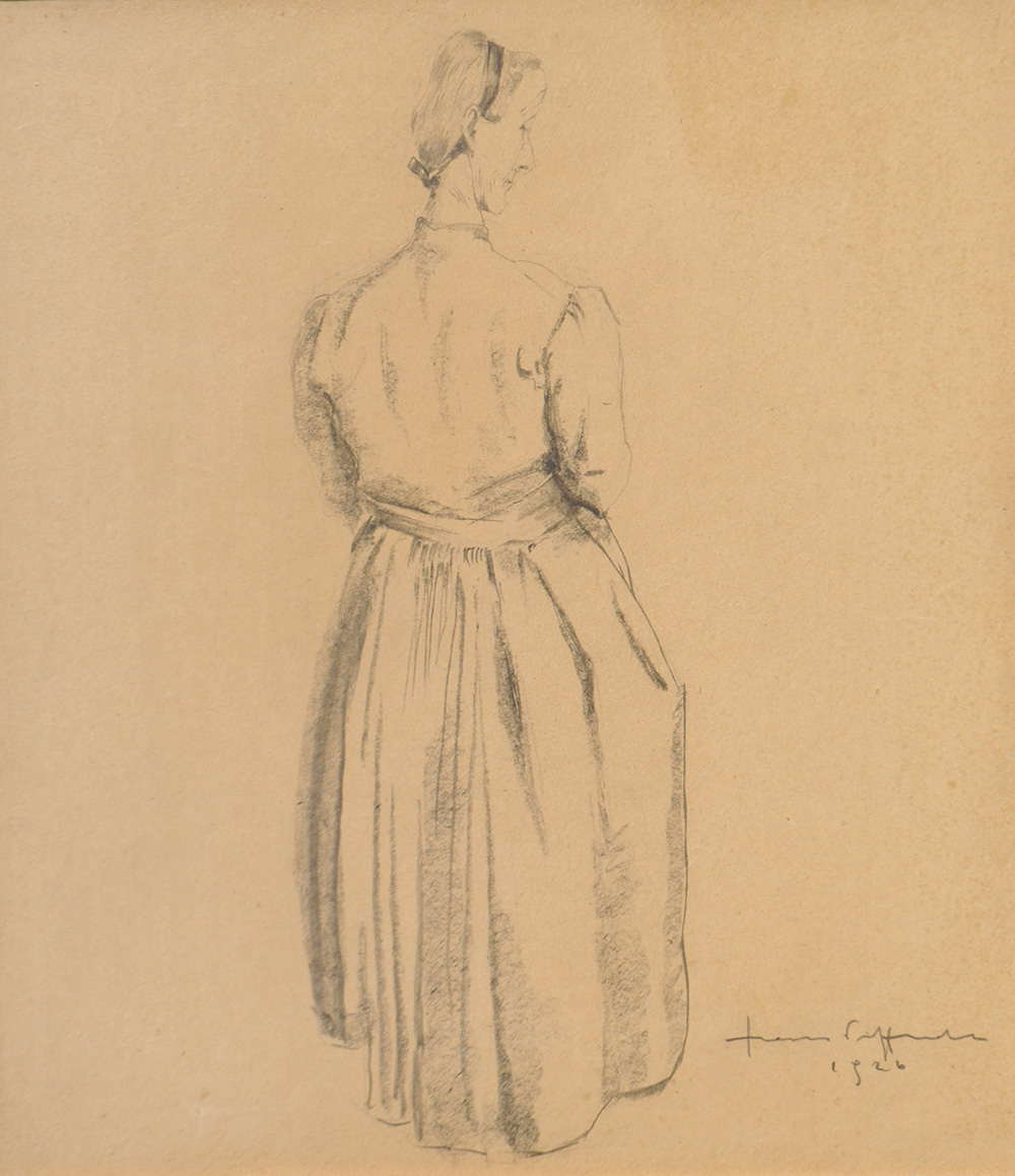 Lotto 402 | Hans Piffrader Contadina, 1926;Matita, carboncino su carta, 28 x 24,5 cm...
