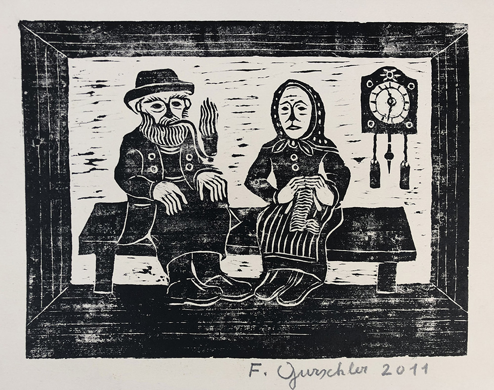 Friedrich Gurschler (* Schnals/Senales 1923) Coppia di contadini nella Stube, 2011;Xilografia, 26 x 34 cm, in cornice