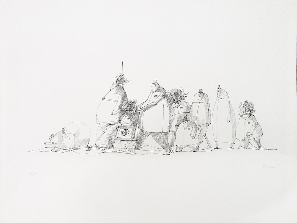 Paul Flora (Glurns/Glorenza 1922 – Innsbruck 2009) Altwiener Figuren, 1971;Litografia, 50 x 65,5 cm (foglio)