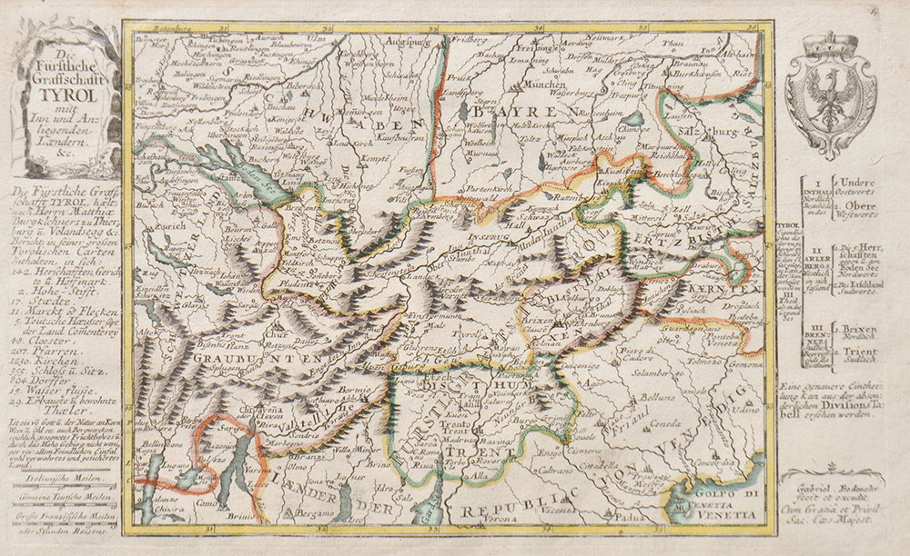 Gabriel Bodenehr Carta geografica “Die fürstliche Graffschafft Tyrol, 1724;Acquaforte colorata, 20.5 x 32 cm
