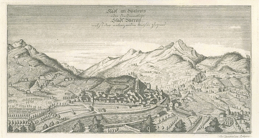 L. Zanconti Città an Mairain – città di Merano;Incisione in rame, 29 x 44 cm