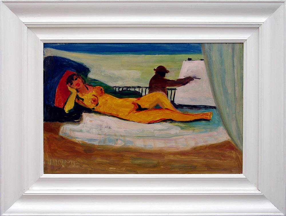 Salvatore Fiume 1915, Comiso (Rg) - 1997, Milano (Mi) - [Italia] Le grand peintre olio su masonite 35x55 cm 1988 firma dell'artista in basso a sinistra; opera con cornice; provenienza precedente studio dell'artista certificato di autenticità Picenum