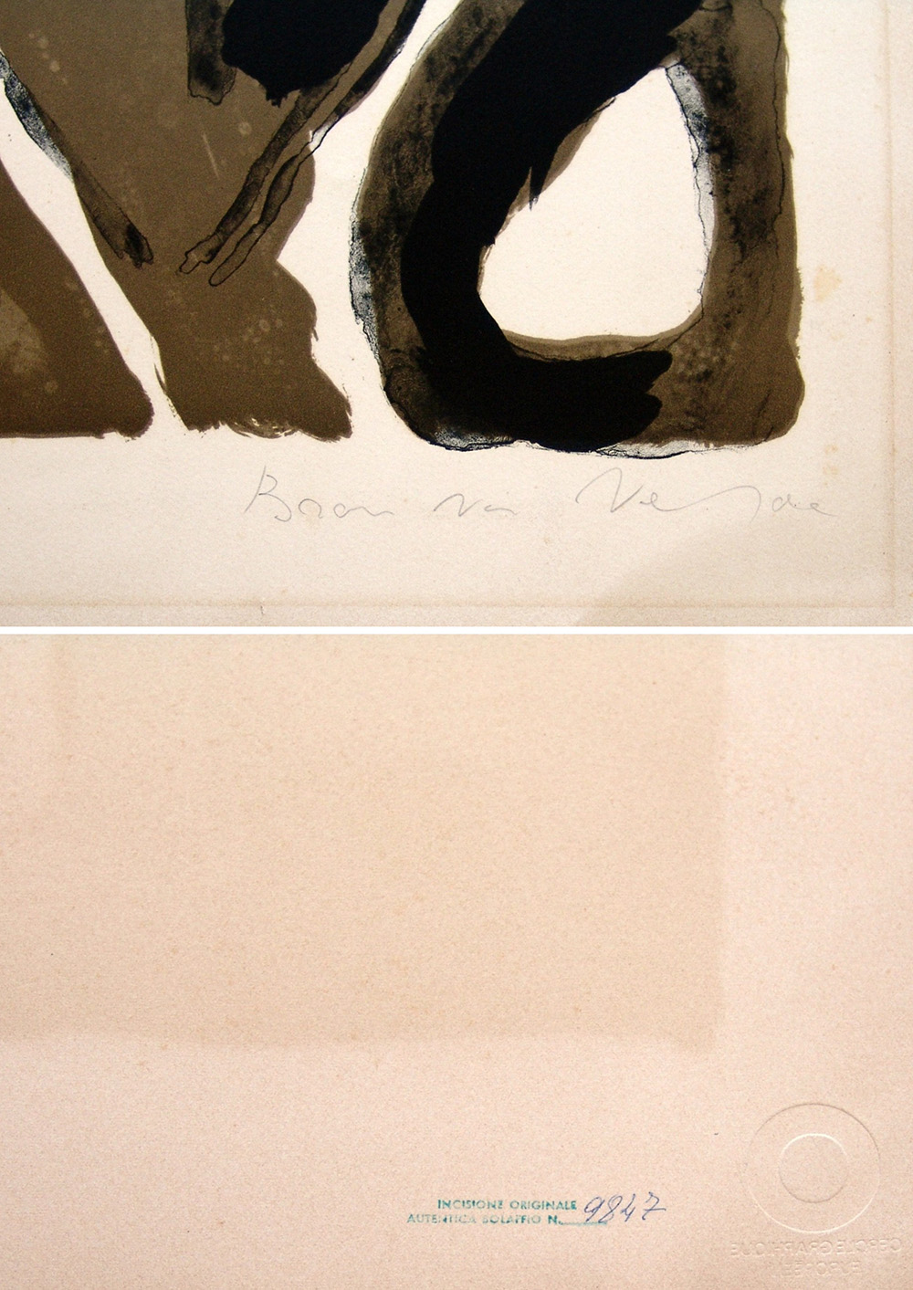 Bram Van Velde 1895, Zoeterwoude (Olanda) - 1981, Grimaud (Francia) - [Olanda] senza titolo litografia 75,5x55,5 cm es. 90/200; firma dell'artista in basso a destra e timbro Cercle Graphique Européen in basso a sinistra certificato di autenticità Picenum