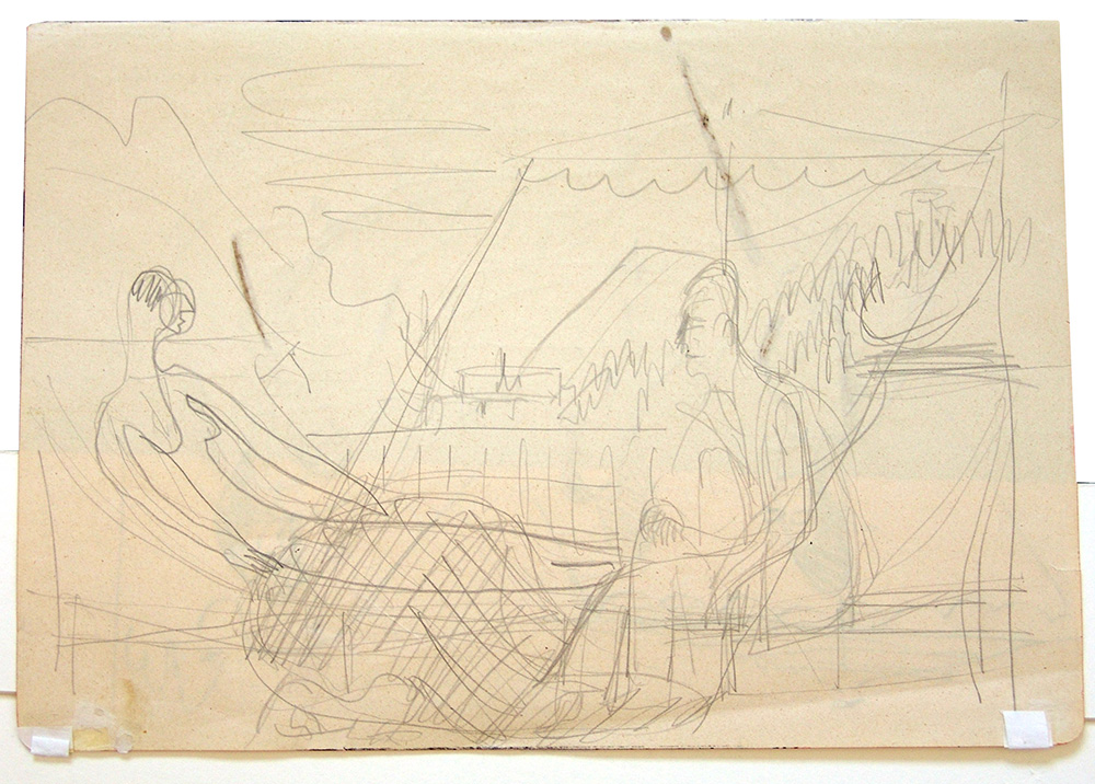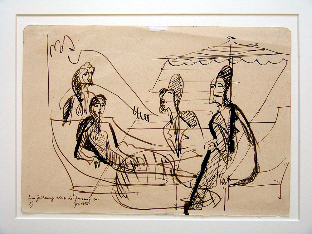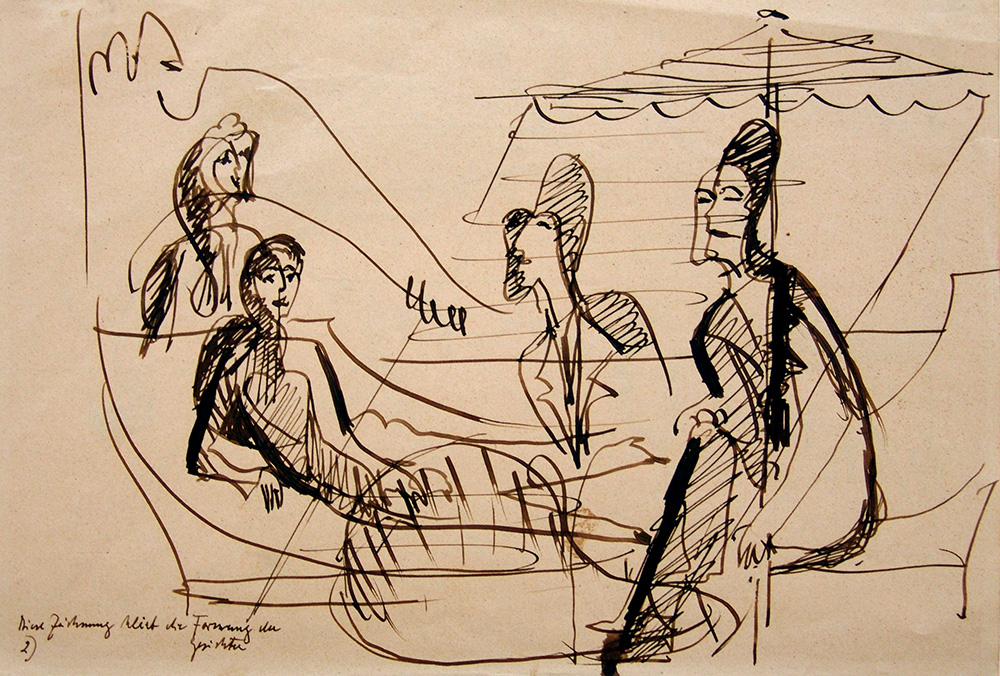 Ernst Ludwig Kirchner 1880, Aschaffenburg (Germania) - 1938, Davos (Svizzera) - [Germania] Mann und Frau im Gesprach unter ein Sonnenschirm inchiostro su carta 20,5x29,5 cm 1935 disegno a matita sul verso opera pubblicata in "Galleria Giulia, la collezione di una galleria, volume II" Edizioni Gabriele Mazzotta, 2000