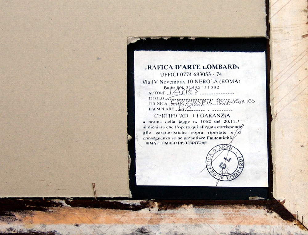 Antoni Tàpies 1923, Barcellona - 2012, Barcellona - [Spagna] senza titolo serigrafia 70x50 cm es. h.c.; firma dell’artista in basso a destra; opera con cornice certificato di autenticità della Grafica d'Arte Lombardi di Roma sul retro