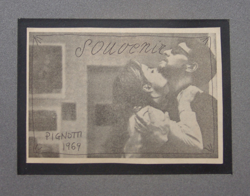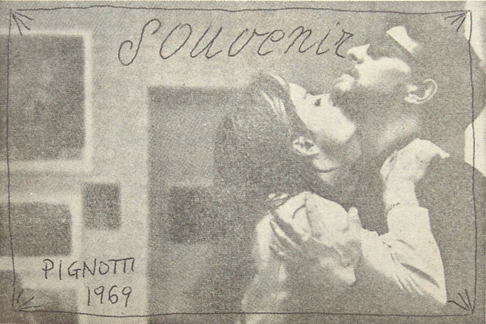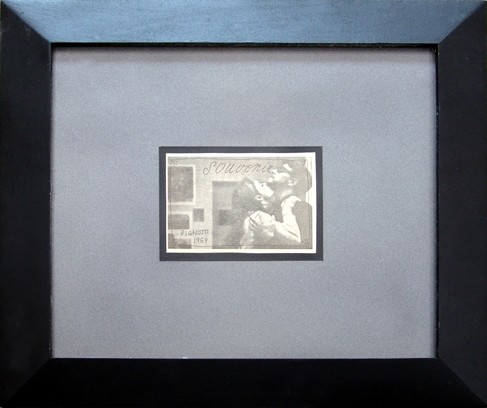 Lamberto Pignotti 1926, Firenze (Fi) - [Italia] Souvenir tecnica mista su carta 10,5x14 cm 1969 firma dell’artista in basso a sinistra; opera con cornice certificato di autenticità dell’artista su fotografia