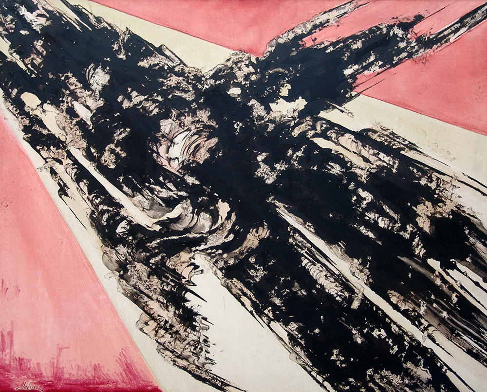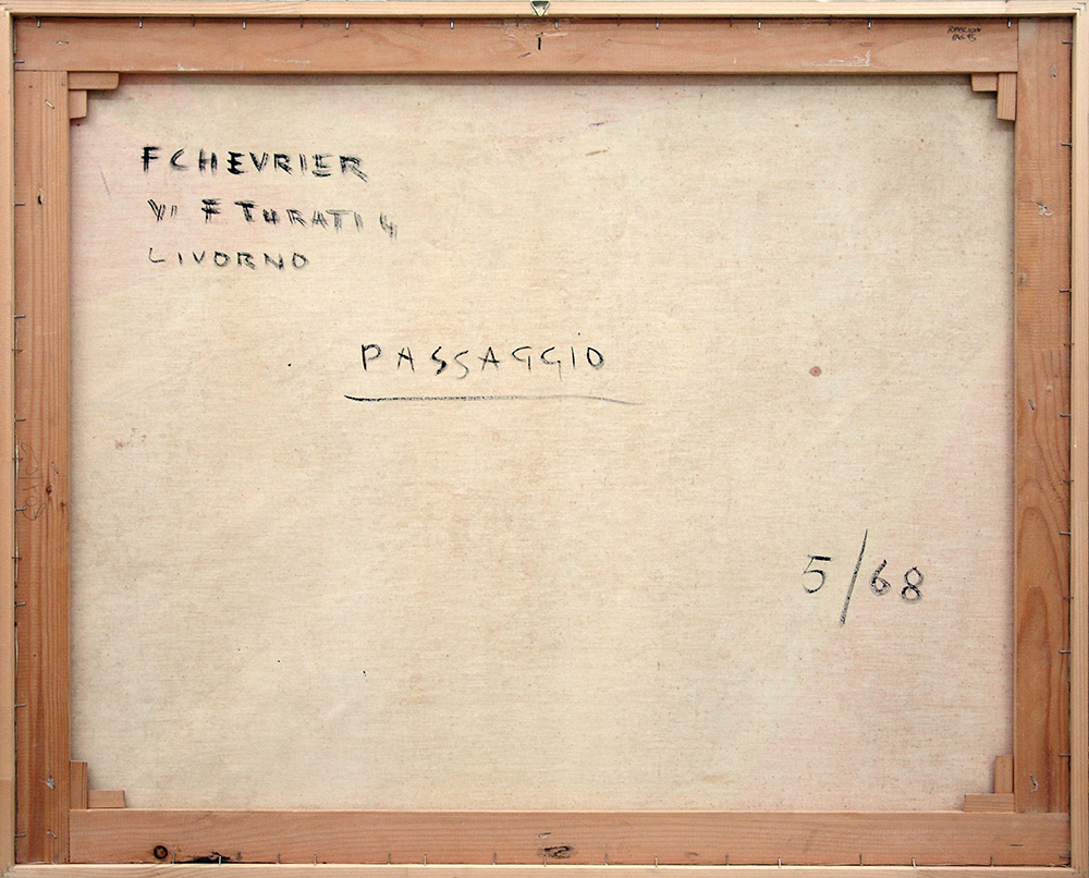 Ferdinando Chevrier 1920, Livorno (Li) - 2005, Livorno (Li) - [Italia] Passaggio tecnica mista su tela 80x100 cm 1968 firma dell'artista in basso a sinistra e sul retro; opera con cornice certificato di autenticità dell'artista su fotografia; certificato di autenticità della Meeting Art di Vercelli; opera pubblicata nel catalogo della mostra "Ferdinando Chevrier, vivere l'immaginario" esposta presso la Galleria Giraldi di Livorno nel 2002