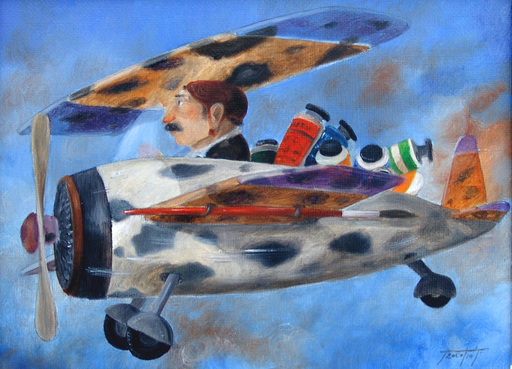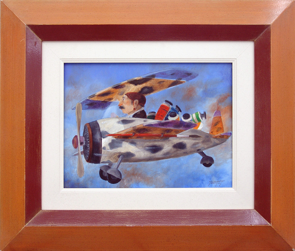 Pino Procopio 1954, Guardavalle (Cz) - [Italia] Pittore volante olio su tela 30x40 cm firma dell'artista in basso a destra; opera con cornice certificato di autenticità dell'artista su fotografia