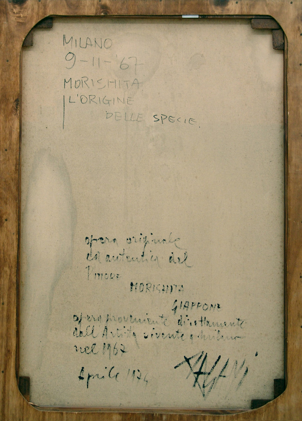 Keizo Morishita 1944, Kitakyushu (Giappone) - 2003, Milano (Mi) - [Giappone] Origine della specie tecnica mista su tela 101x71 cm 1967 opera con cornice certificato di autenticità della Meeting Art di Vercelli; dichiarazione di autenticità a firma Pagani sul retro
