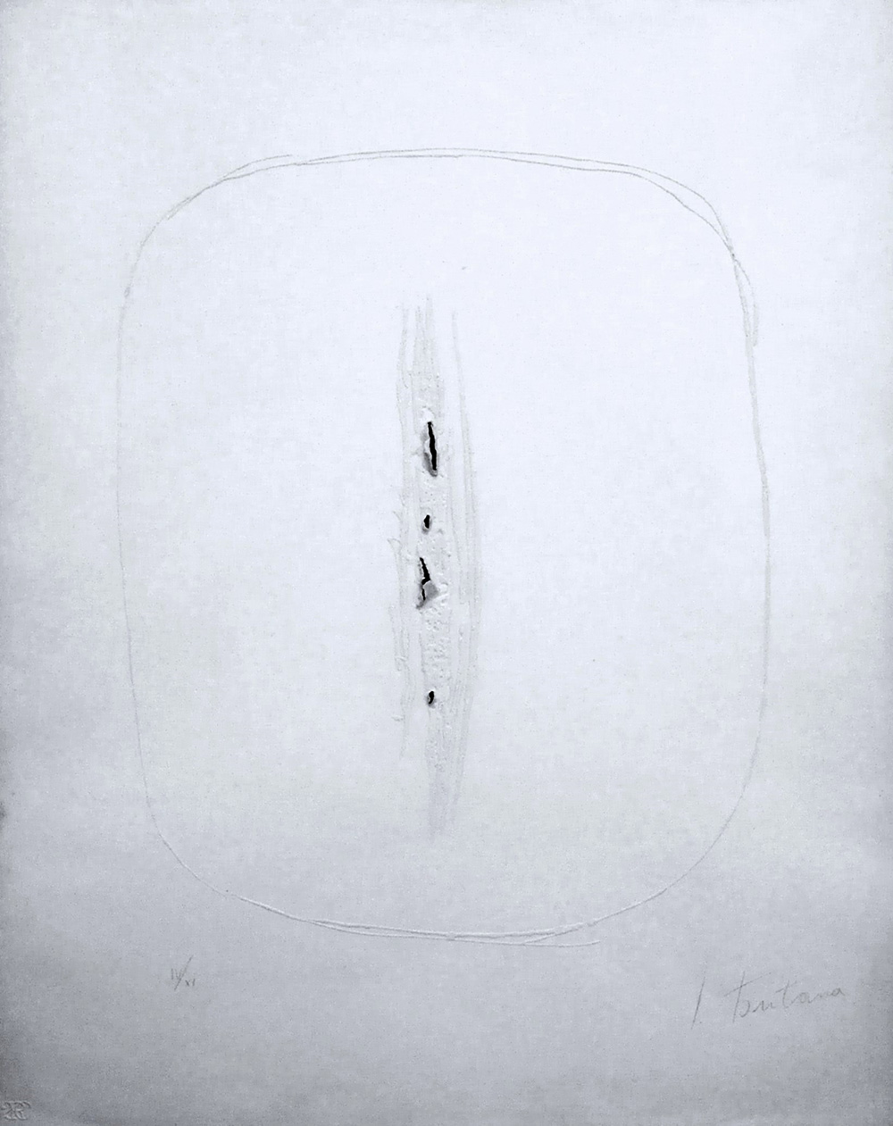 Lucio Fontana 1899, Rosario (Argentina) - 1968, Comabbio (Va) - [Italia] Concetto spaziale acquaforte, goffratura, buchi 63,5x50 cm 1964 es. IV/XI, tiratura 50 esemplari + 11 HC; firma dell’artista in basso a destra e timbro 2RC in basso a sinistra; opera con cornice opera pubblicata in "Lucio Fontana - incisioni, grafica, multipli, pubblicazioni" di Harry Ruhé e Camillo Rigo, Reverdito Edizioni