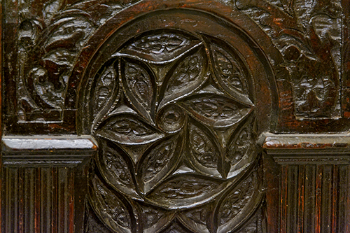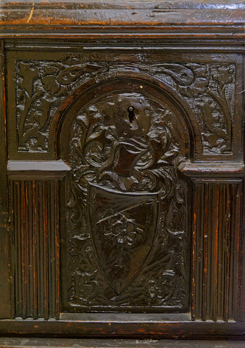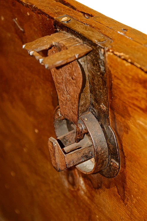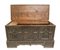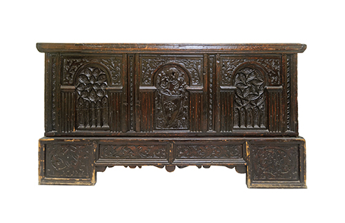 Manifattura tirolese, fine del XIX secolo Cassone dotale in stile neogotico Legno di abete, ferro 91x180x71 cm Data: "1503" (fittizia) Il bene è soggetto a vincolo pertinenziale ex DDS 6852 del 30 /6/08 - 23/5 Condizione superficie: 60% (usura e probabili ridipinture -cfr. gli interstizi tra gli intagli) Cassone in legno scolpito, con fronte decorato ad intaglio con rosoni laterali e scudo centrale, con incisa la data 1503, serratura in stile Periodo: 1900 - 1960 Categoria: Mobili