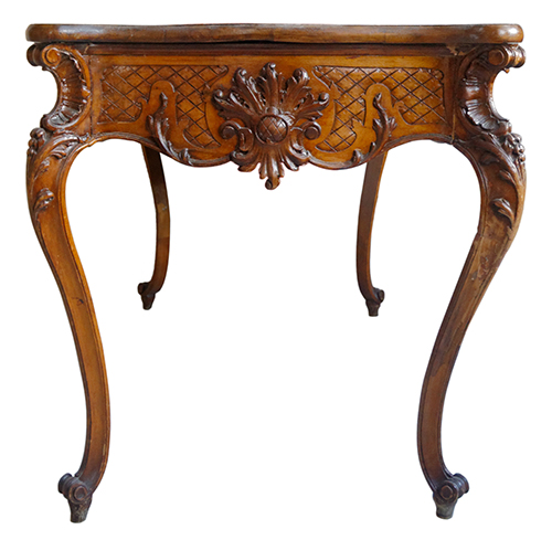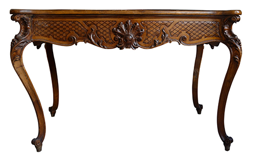 Manifattura meridionale, I quarto del XX secolo Tavolo da centro di profilo mosso Legno di noce intagliato e scolpito 75x130x82 cm Il bene è libero da vincoli Condizione supporto: 40% (usura, danni da urto, parti mancanti, piano sostituito con un foglio di plastica) Condizione superficie: 50% Periodo: 1900 - 1960 Categoria: Mobili