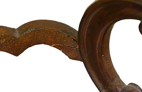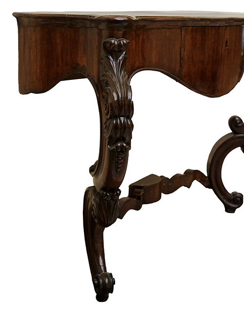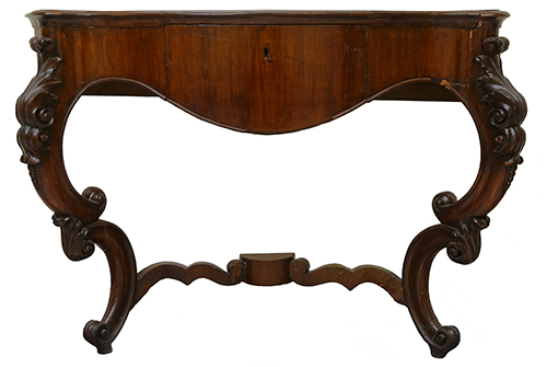 Manifattura siciliana, metà del XIX secolo Consolle Legno di noce intagliato e scolpito. Fronte e fianchi rivestiti in legno di noce 83x118,5x35 cm Il bene è libero da vincoli Condizione supporto: 60% (parti scollate o spezzate, in particolare sul lato destro, tarli) Condizione superficie: 60% (usura, perdita di elementi del decoro ligneo, per esempio, il listello che percorre la base del mobile) Periodo: XIX sec. Categoria: Mobili