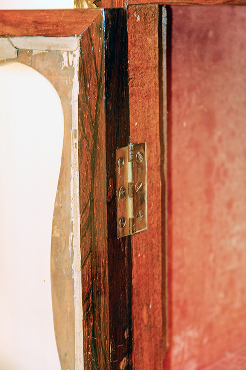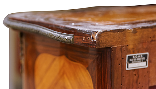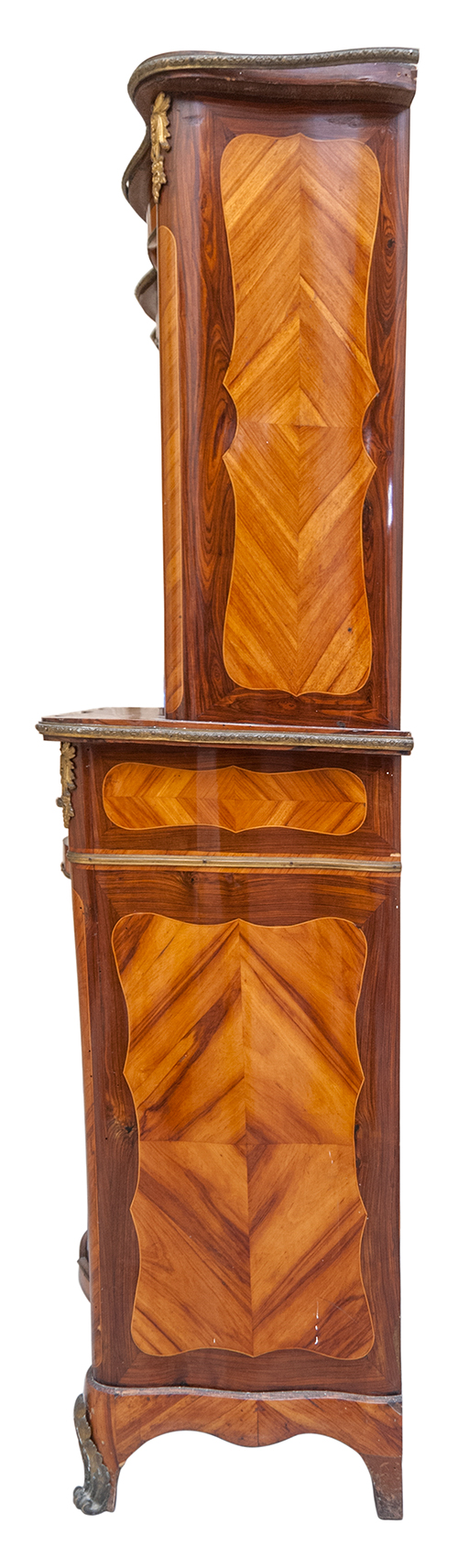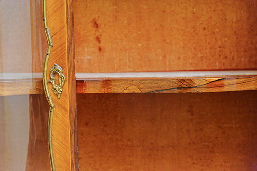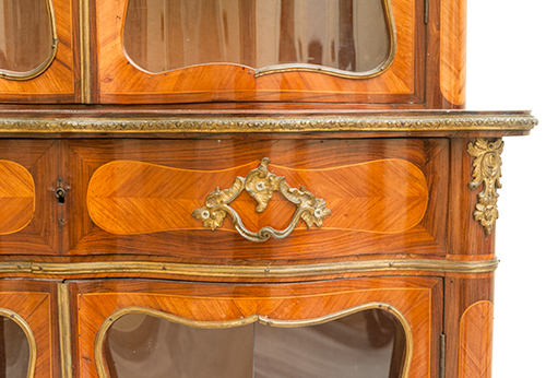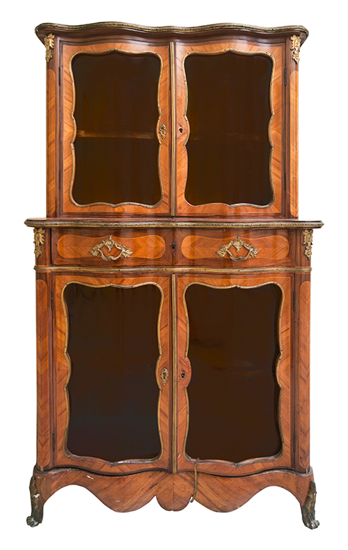 Manifattura francese, inizi del XIX secolo Vetrinetta a doppio corpo Legno impiallacciato in bois de ros e palissandro con filettature in acero. Maniglieria e applicazioni in metallo dorato. 148x88x38,5 cm Il bene è libero da vincoli Condizione supporto: 80% (una lastra in vetro sostituita) Condizione superficie: 50% (cadute del decoro ligneo, parti del decoro metallico sostituite o mancanti) Periodo: XIX sec. Categoria: Mobili