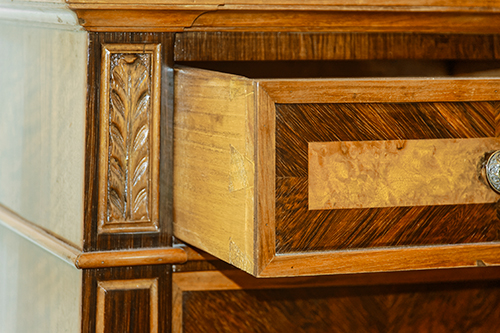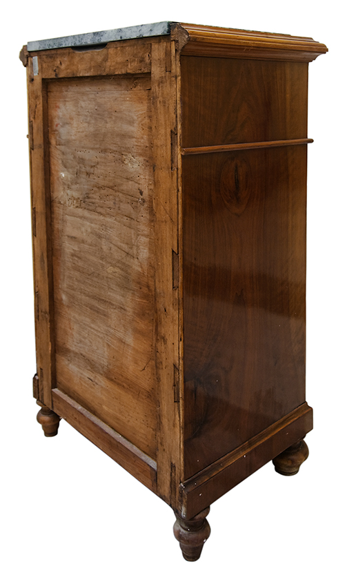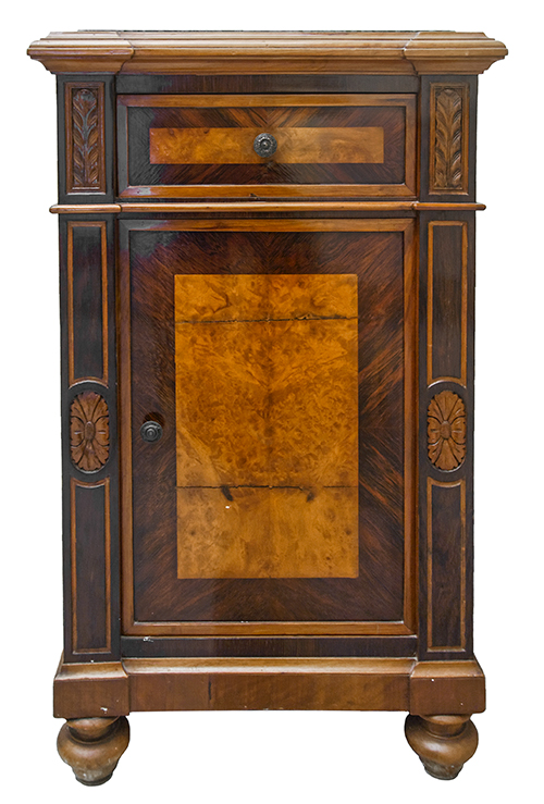 Manifattura siciliana, fine del XIX secolo Comodino Legno intagliato e impiallacciato in palissandro con riserva in radica e filettature in noce chiaro. Piano incassato in marmo. 90x55x37,5 cm Il bene è libero da vincoli Condizione supporto: 80% Condizione superficie: 80% Periodo: XIX sec. Categoria: Mobili