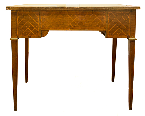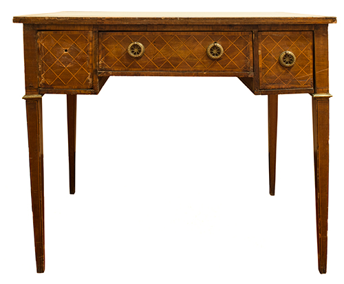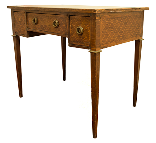 Manifattura siciliana, inizi del XX secolo Scrittoio Fusto in legno di pino impiallacciato in mogano e intarsiato con marqueterie a losanghe in acero 81x98x63,5 cm Il bene è libero da vincoli Condizione supporto: 50% (perdita di consistenza della struttura) Condizione superficie: 40% (usura, caduta della impiallacciatura) Lo scrittoio presenta decorazione ad intarsio in essenze varie con marqueterie a losanghe. Maniglie circolari, piano con pannello in vetro e 3 cassetti sul fronte Periodo: 1900 - 1960 Categoria: Mobili