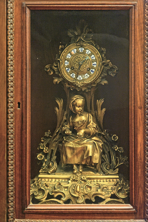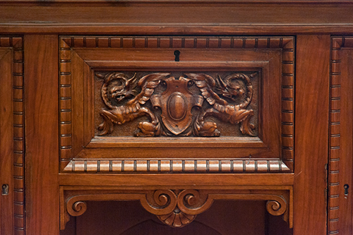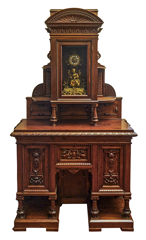 Manifattura siciliana, fine del XIX - inizi del XX secolo Servante con alzata e orologio Legno di noce intagliato e scolpito; metallo e altri materiali per parti meccaniche 206x113,5x49,5 cm Il bene è libero da vincoli Condizione supporto: 80% (meccanismo dell'orologio non esaminato) Condizione superficie: 80% Periodo: XIX sec. Categoria: Mobili