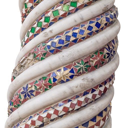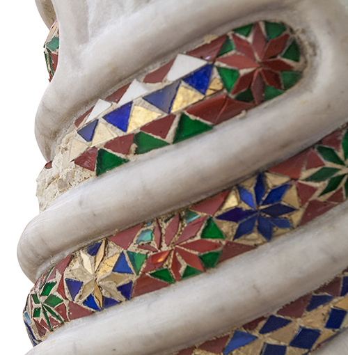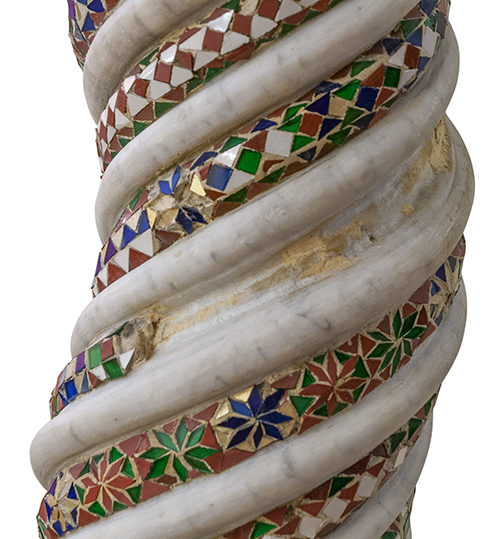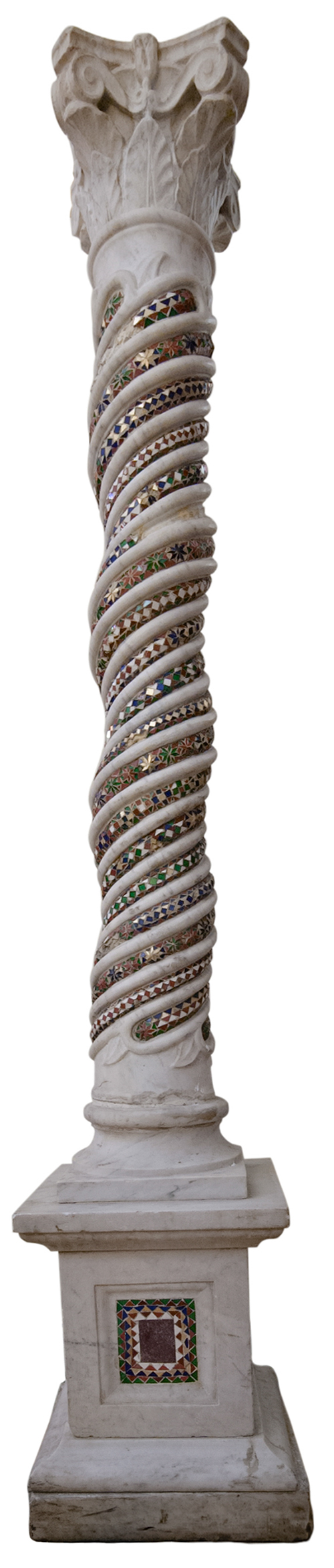 Roma, Seconda metà del XII-inizi del XIII secolo, Bottega dei Vassalletto ? Colonnina tortile romanica Marmo bianco scolpito, mosaico lapideo e vitreo 158x30 cm Il bene è soggetto a vincolo pertinenziale ex DDS6909 del 16/7/09 - 34 Condizione supporto: 70% Condizione superficie: 40% (danni alle superfici marmoree, caduta di parte delle tessere musive) Colonnina tortile romanica con decorazioni cosmatesce e capitello con motivo a palmette Periodo: V-XV secc. Categoria: Sculture