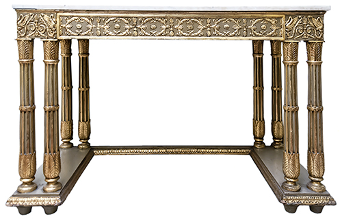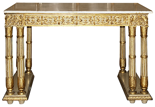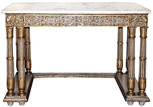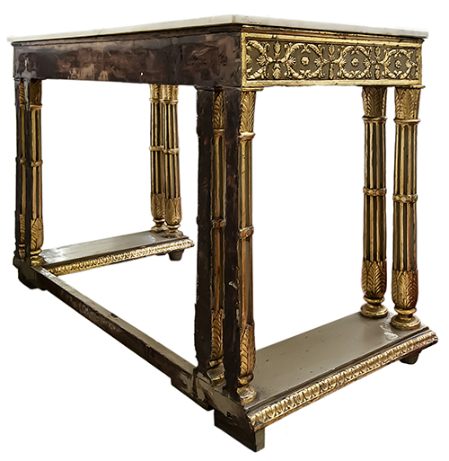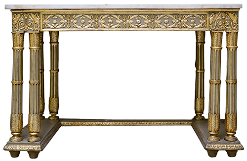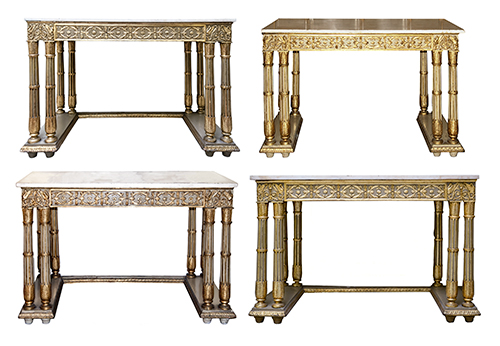 Manifattura palermitana, fine del XIX - inizi del XX secolo Quattro consolle Legno intagliato, dpinto e dorato, marmo bianco 97,5x148x68,5 cm Il bene è soggetto a vincolo pertinenziale ex DDS6909 del 16/7/09 - 25 Condizione supporto: 90% (mancanze, usura e danni da urto, tarli) Condizione superficie: 70% (superfici ridorate a vernice) 4 oggetti Consolle con montanti a doppia colonnina egizia e fascia sottopiano intagliata a motivi vegetali Periodo: XIX sec. Categoria: Mobili