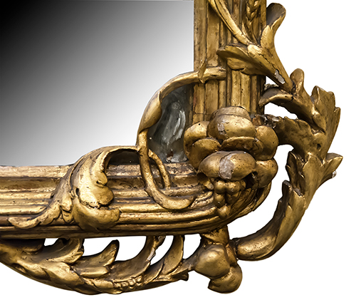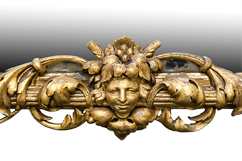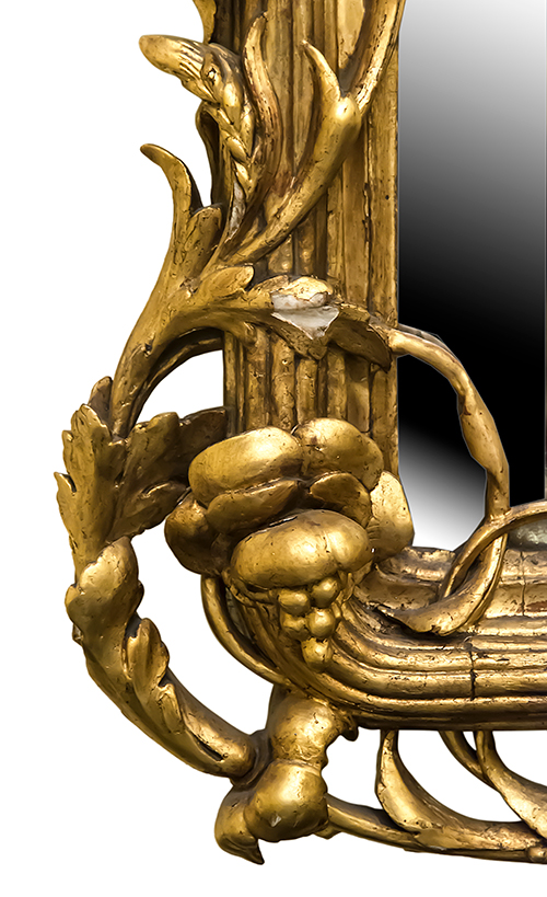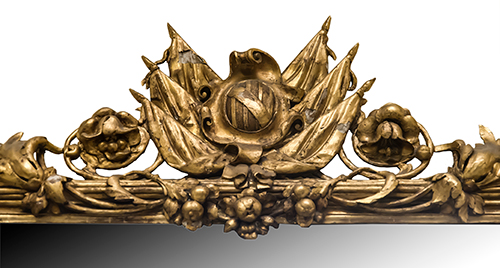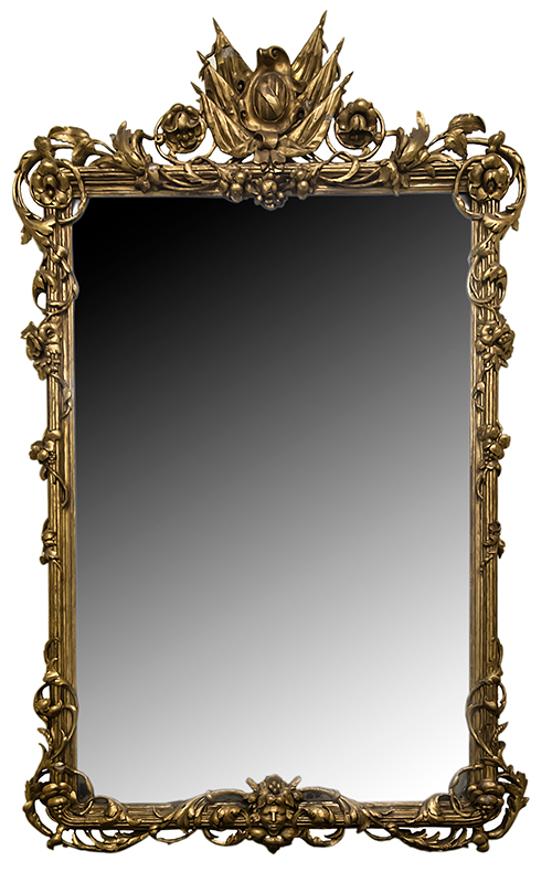 Manifattura palermitana, inizi del XX secolo Specchiera con intagli a racemi e stemma gentilizio sulla cimasa Legno intagliato e dorato 250x150x15 cm Il bene è soggetto a vincolo pertinenziale ex DDS6909 del 16/7/09 - 47 Condizione supporto: 90% (danni da urto. Non esaminata la schiena) Condizione superficie: 70% (cadute della doratura e ridoratura) Parte di coerente arredo gentilizio di fattura citazionista ottocentesca, ma realizzato con sapienza e abilità da un ottimo ebanista al servizio di famiglie aristocratiche, come rileva Vittorio De Bonis Periodo: 1900 - 1960 Categoria: Mobili