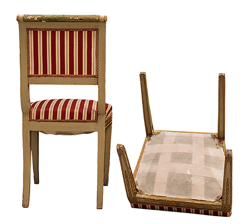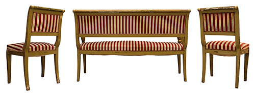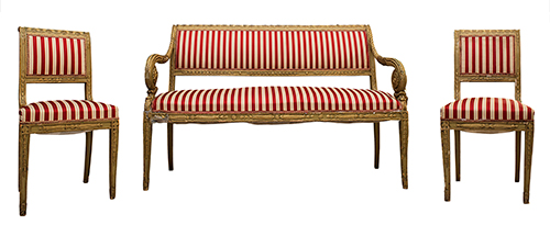 Produzione siciliana, fine XIX - inizi XX secolo Due salotti in stile Transizione Legno intagliato e dorato, schienale e seduta imbottiti e tappezzati con stoffa a bande verticali rosse e bianche Qattro sedie: 87x46x58 cm Due canapé: 92,5x150x65 cm Il bene è libero da vincoli Condizione supporto: 50% (strutture lignee spezzate e malamente fissate) Condizione superficie: 60% (usura, laccatura e doratura danneggiate e riprese) 6 oggetti Periodo: XIX sec. Categoria: Mobili
