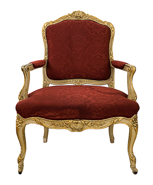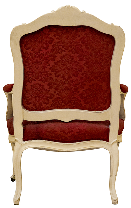 Manifattura siciliana, XX secolo Tre poltrone in stile Luigi XV Legno intagliato, laccato e dorato nei profili, imbottitura con tappezzeria in stoffa rossa, piedi dotato di rotelle 99x68x60 cm Seduta: 42 cm Il bene è libero da vincoli Condizione supporto: 80% Condizione superficie: 60% (usura, doratura ripresa e mancante) 3 oggetti Periodo: 1900 - 1960 Categoria: Mobili