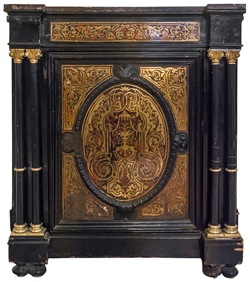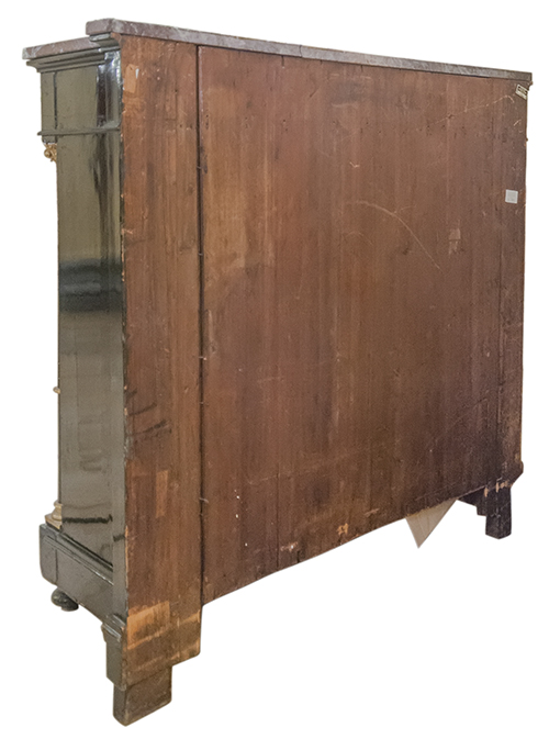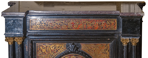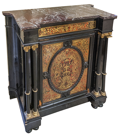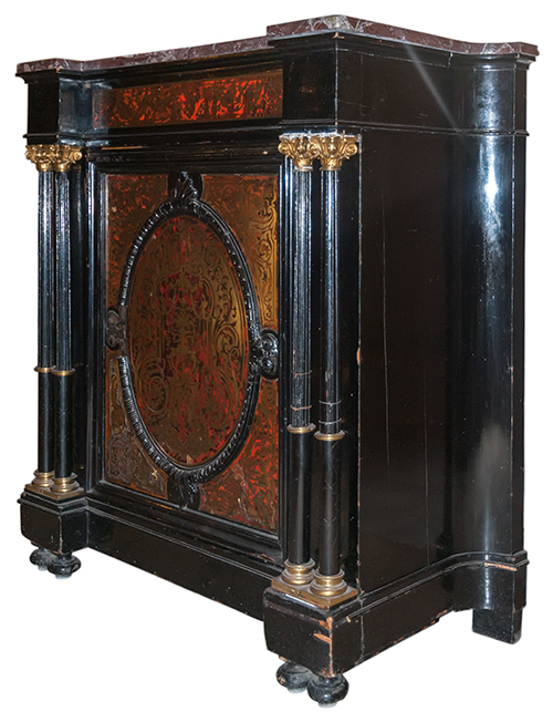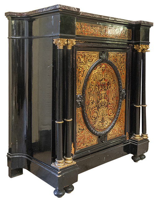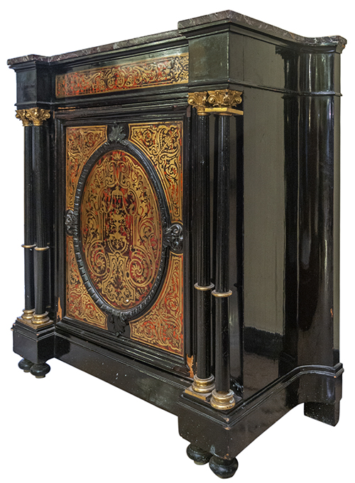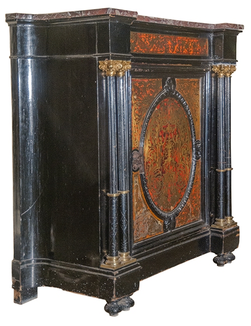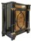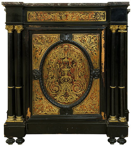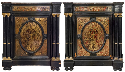 Manifattura meridionale, fine del XIX secolo Due cabinet a consolle, fine del XIX secolo Legno intagliato, ebanizzato,intarsi in ottone su fondo in tartaruga, capitelli in bronzo dorato, marmo sagomato 108x43x106 cm Il bene è libero da vincoli Condizione supporto: 50% (struttura da consolidare Condizione superficie: 60% (mancanze e danni da urti, superficie lamata) 2 oggetti Cabinet con montanti a doppia colonnina, lavorazione alla Boulle e piano in marmo Periodo: XIX sec. Categoria: Mobili