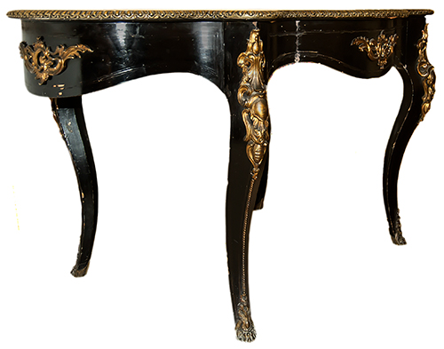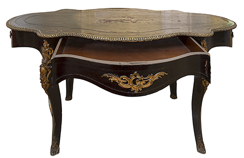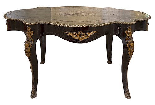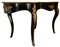 Manifattura meridionale, 1910-1920 Tavolinetto da centro Legno ebanizzato e intarsiato con filettature in ottone, applicazioni in metallo dorato 76x146x90 cm Il bene è libero da vincoli Condizione supporto: 60% Condizione superficie: 60% (carenze e danni, probabilmente manca un piano in cristallo) Tavolinetto di forma lobata Periodo: 1900 - 1960 Categoria: Mobili