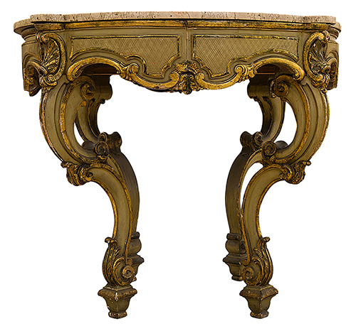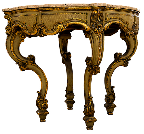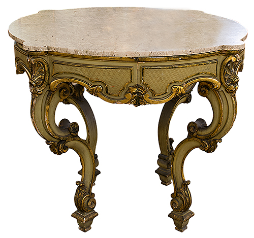 Produzione meridionale (?), Inizi del XX secolo Tavolinetto da centro Legno intagliato a volute, laccato e dorato lungo i profili, piano in marmo rosa 96x122,5 cm Il bene è libero da vincoli Condizione supporto: 70% Condizione superficie: 50% (numerose cadute di stucco e di colore, danni da urto, ridoratura a vernice, mancanze) Tavolo rotondo con lobi in corrispondenza delle gambe Periodo: 1900 - 1960 Categoria: Mobili