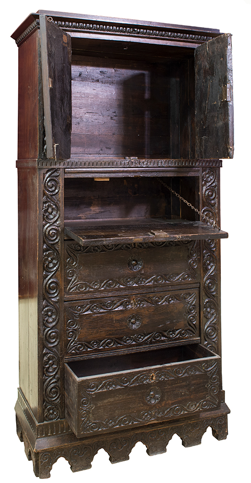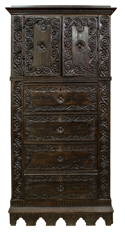 Produzione meridionale (?), fine del XIX secolo Mobile cassettiera Legno intagliato 179x83x41 cm Il bene è libero da vincoli Condizione supporto: 80% (Schiena non verificata) Condizione superficie: 70% Mobile a quattro ordini di cassetti, sormontati da due antine Periodo: XIX sec. Categoria: Mobili