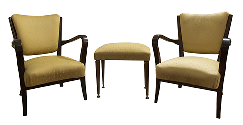 Manifattura italiana, metà del XX secolo Fornitura da salotto composta da due poltroncine e un panchetto Legno, velutto Poltroncine: 60x77,5x56 cm; Panchetto: 51x48x31,5 cm Il bene è libero da vincoli Condizione supporto: 90% Condizione superficie: 80% (usura, macchie) 3 oggetti Periodo: 1900 - 1960 Categoria: Mobili