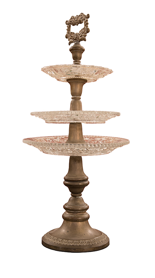 Manifattura italiana, metà del XX secolo Alzata portafrutta a tre piani Metallo e vetro 46x21,5 cm Il bene è libero da vincoli Condizione supporto: 80% (danni da urti) Condizione superficie: 70% (depositi di fusione e successivi) Periodo: 1900 - 1960 Categoria: Soprammobili altro materiale pregiato