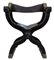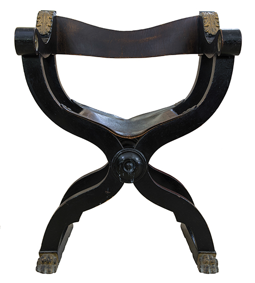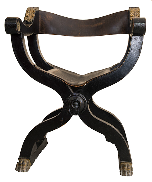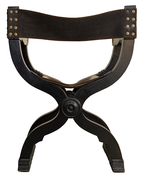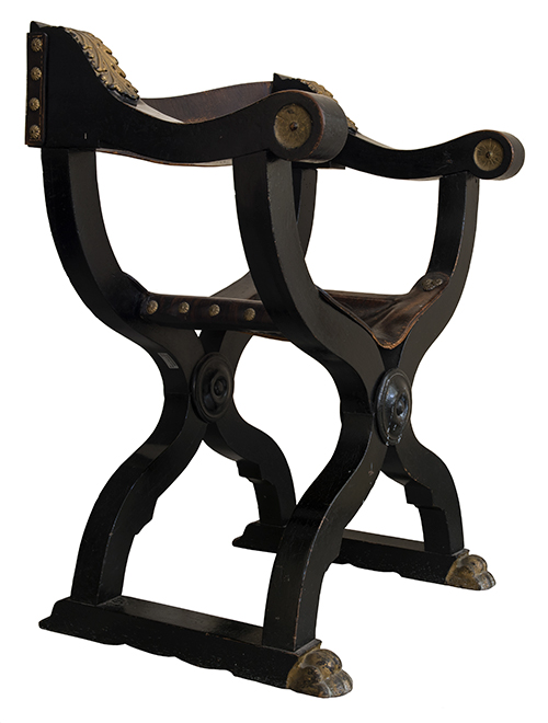 Produzione meridionale (?), fine del XIX - inizi del XX secolo Sedia modello Savonarola Legno ebanizzato con dettagli intagliati e dorati, schienale e seduta in cuoio 90x69x53 cm Il bene è libero da vincoli Condizione supporto: 80% Condizione superficie: 80% (usura) Periodo: XIX sec. Categoria: Mobili