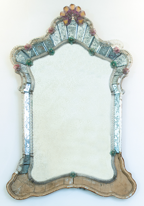 Fratelli Tosi, 1960 ca. Specchiera Vetro a specchio e cornice poliripartita in vetro di Murano 138x92 cm Il bene è libero da vincoli Condizione supporto: 60% Condizione superficie: 40% (danni e mancanze) Specchio in stile veneziano, inciso, vetro di murano, doppia cornice, bordura sagomata con applicazioni di canne in torchon, fregi e fiori vitrei, cimasa floreale a sbalzo, telaio in legno Periodo: post 1960 Categoria: Mobili