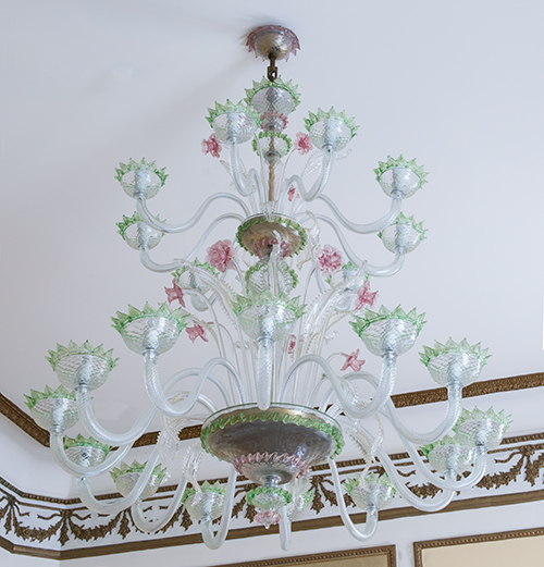 Manifattura veneziana, 1940 ca. Lampadario Vetro di Murano soffiato 210x156 cm ca. Il bene è libero da vincoli Condizione supporto: 90% Condizione superficie: 90% Lampadario in vetro soffiato di Murano con decorazioni rubino e verde Periodo: 1900 - 1960 Categoria: Mobili
