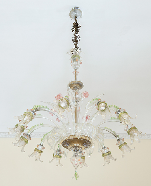 Manifattura veneziana, 1940 ca. Lampadario Vetro di Murano soffiato 180x120 cm ca. Il bene è libero da vincoli Condizione supporto: 90% Condizione superficie: 90% Lampadario in vetro di Murano, decorato con vari tipi di fiori variopinti Periodo: 1900 - 1960 Categoria: Mobili
