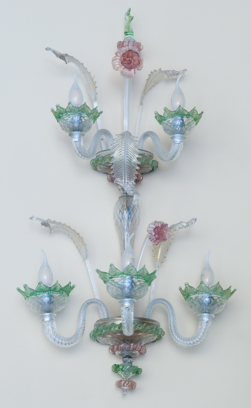 Manifattura veneziana, 1940 ca. Applique a cinque luci Vetro di Murano soffiato 93,5x50 cm Il bene è libero da vincoli Condizione supporto: 90% Condizione superficie: 90% Applique in vetro soffiato di Murano con decorazioni floreali in verde e rosa Periodo: 1900 - 1960 Categoria: Mobili