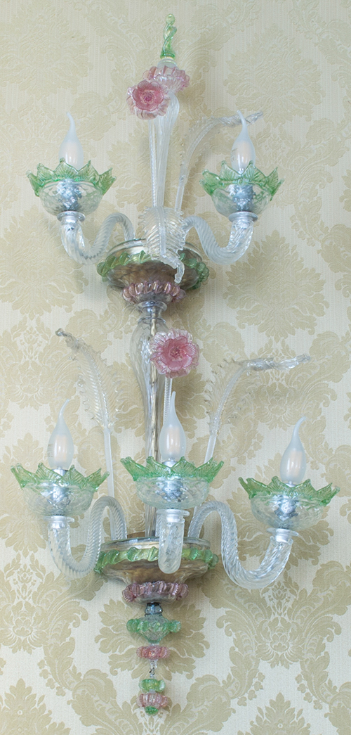 Manifattura veneziana, 1940 ca. Applique a cinque luci Vetro di Murano soffiato 93,5x50 cm Il bene è libero da vincoli Condizione supporto: 90% Condizione superficie: 90% Applique in vetro soffiato di Murano con decorazioni floreali in verde e rosa Periodo: 1900 - 1960 Categoria: Mobili