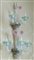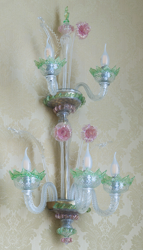 Manifattura veneziana, 1940 ca. Applique a cinque luci Vetro di Murano soffiato 93,5x50 cm Il bene è libero da vincoli Condizione supporto: 90% Condizione superficie: 90% Applique in vetro soffiato di Murano con decorazioni floreali in verde e rosa Periodo: 1900 - 1960 Categoria: Mobili