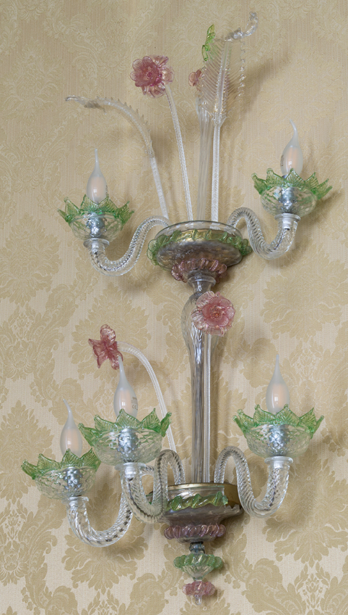 Manifattura veneziana, 1940 ca. Applique a cinque luci Vetro di Murano soffiato 93,5x50 cm Il bene è libero da vincoli Condizione supporto: 90% Condizione superficie: 90% Applique in vetro soffiato di Murano con decorazioni floreali in verde e rosa Periodo: 1900 - 1960 Categoria: Mobili