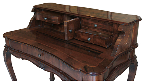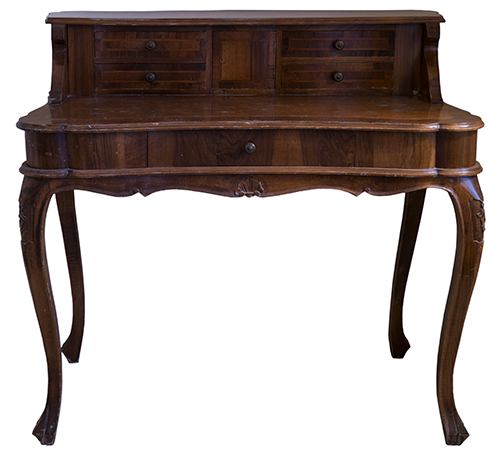 Manifattura siciliana (?), 1950 ca. Coppia di scrittoi Legno di noce 97,5x102x59,5 cm Il bene è libero da vincoli Condizione supporto: 80% (segni di usura; in uno dei due scrittoi una gamba è rotta) Condizione superficie: 90% 2 oggetti Scrittoi di forma mossa, con piano sagomato, alzata con quattro cassettini e anta e gambe centinate Periodo: 1900 - 1960 Categoria: Mobili