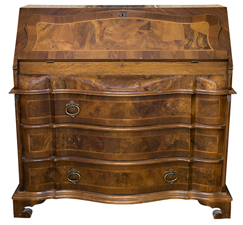 Manifattura veneta o siciliana (?), 1950 ca. Ribalta Struttura lignea lastronata e marchettata in essenze varie, applicazioni in bronzo 97x97x44 cm Il bene è libero da vincoli Condizione supporto: 80% (mancano due maniglie) Condizione superficie: 80% (perdita di parti della lastronatura) Ribalta in stile veneto settecentesco, con tre cassetti sul fronte e quattro cassettini interni al piano ribaltabile, maniglie semplici di forma ovale, due per cassetto, piedi a mensola Periodo: 1900 - 1960 Categoria: Mobili