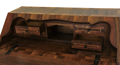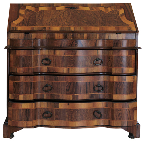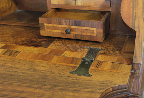 Manifattura veneta o siciliana (?), 1950 ca. Ribalta Struttura lignea lastronata e marchettata in essenze varie, applicazioni in bronzo 94,5x91,5x44 cm Il bene è libero da vincoli Condizione supporto: 90% Condizione superficie: 85% (lievi segni di usura) Ribalta in stile veneto settecentesco, con tre cassetti sul fronte e quattro cassettini interni al piano ribaltabile, maniglie semplici di forma ovale, due per cassetto, piedi a mensola Periodo: 1900 - 1960 Categoria: Mobili