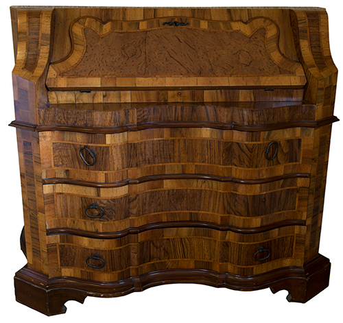 Manifattura veneta o siciliana (?), 1950 ca. Ribalta Struttura lignea lastronata e marchettata in essenze varie, applicazioni in bronzo 102,5x118x50 cm Il bene è libero da vincoli Condizione supporto: 85% (manca una maniglia) Condizione superficie: 80% (perdita di parti della lastronatura) Ribalta in stile veneto settecentesco, con tre cassetti sul fronte e quattro cassettini interni al piano ribaltabile, maniglie semplici di forma ovale, due per cassetto, piedi a mensola Periodo: 1900 - 1960 Categoria: Mobili