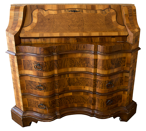 Manifattura veneta o siciliana (?), 1950 ca. Ribalta Struttura lignea lastronata e marchettata in essenze varie, applicazioni in bronzo 102,5x118x50 cm Il bene è libero da vincoli Condizione supporto: 85% (manca una maniglia) Condizione superficie: 80% (perdita di parti della lastronatura) Ribalta in stile veneto settecentesco, con tre cassetti sul fronte e quattro cassettini interni al piano ribaltabile, maniglie semplici di forma ovale, due per cassetto, piedi a mensola Periodo: 1900 - 1960 Categoria: Mobili