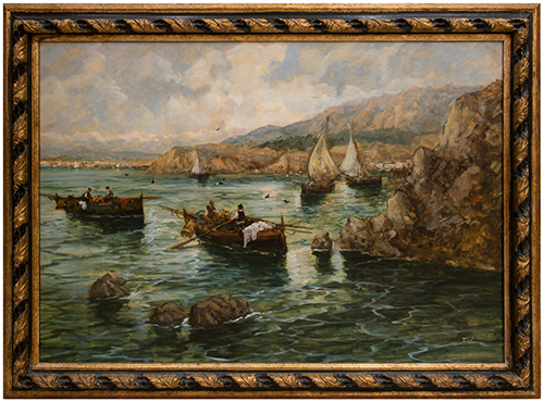 Anonimo, XX secolo Marina con barche da pesca Olio su tela 70x100 cm Il bene è libero da vincoli Condizione supporto: 90% Condizione superficie: 90% Periodo: post 1960 Categoria: Dipinti