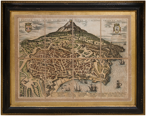 Pierre Mortier (1661-1711) Piantina dell'antica Catania Acquaforte su carta colorata a mano e applicata su tela 42x52 cm Il bene è libero da vincoli Condizione supporto: 90% Condizione superficie: 90% Periodo: post 1960 Categoria: Stampe