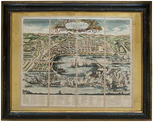 Pierre Mortier (1661-1711) Piantina dell'antica Messina Acquaforte su carta colorata a mano e applicata su tela 42x52 cm Il bene è libero da vincoli Condizione supporto: 90% Condizione superficie: 90% Periodo: post 1960 Categoria: Stampe