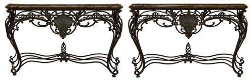 Manifattura siciliana (?), XX secolo Coppia di consolle Ferro battuto, piano...
